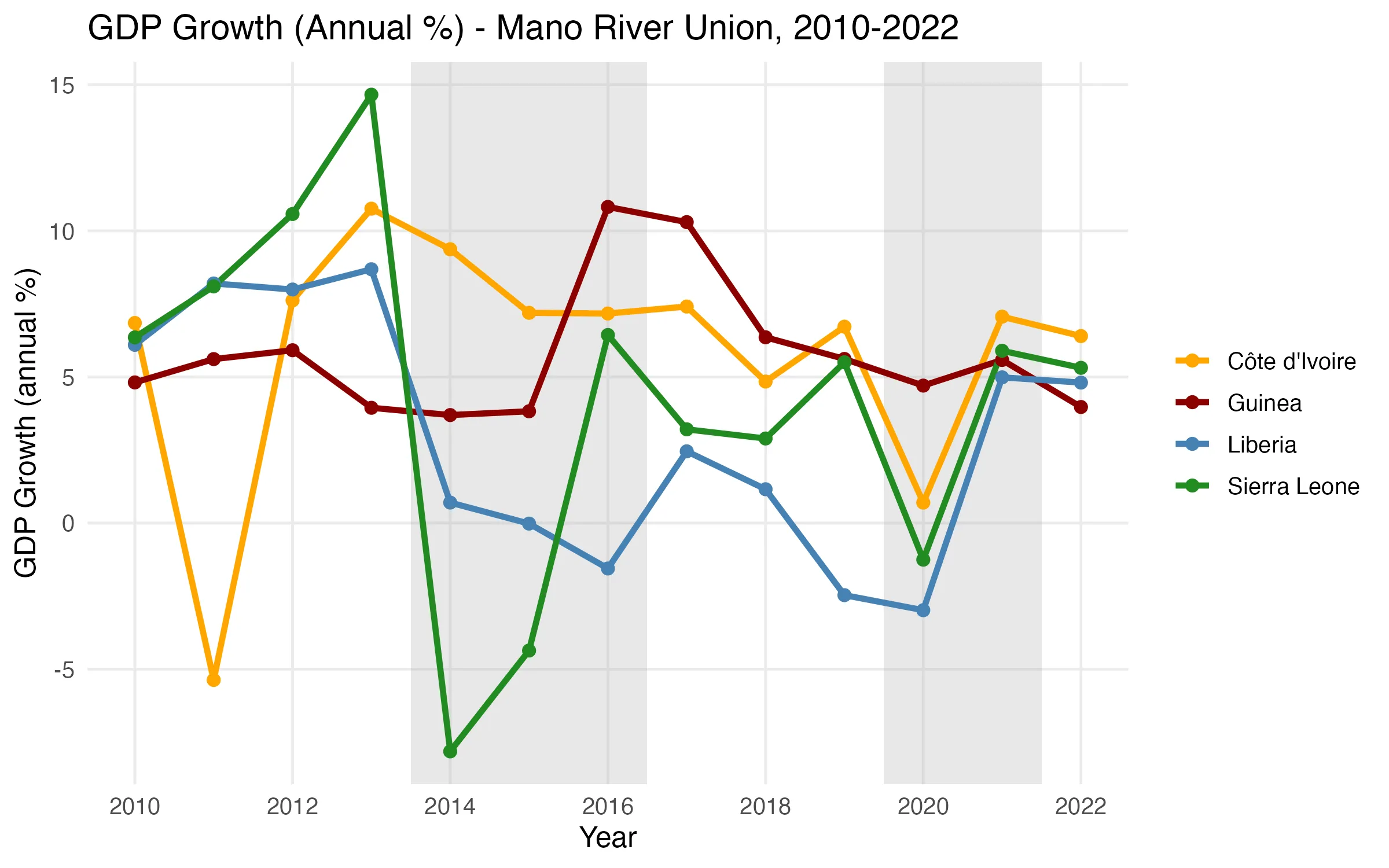 The MRU countries have faced recurrent shocks that have hindered sustained economic growth and poverty reduction. Prolonged civil conflicts in Liberia, Sierra Leone, and Côte d’Ivoire, along with political instability in Guinea, have eroded the state’s capacity and weakened its infrastructure. These challenges were further compounded by the Ebola virus epidemic from 2014 to 2016, which originated in Guinea and spread to Liberia and Sierra Leone, resulting in thousands of deaths and significant economic losses. According to the World Bank (2016), the outbreak caused GDP growth in the most affected countries to decline by over 50 percent during the crisis years. More recently, the COVID-19 pandemic has strained health systems and fiscal stability, highlighting the region’s vulnerability to external shocks.