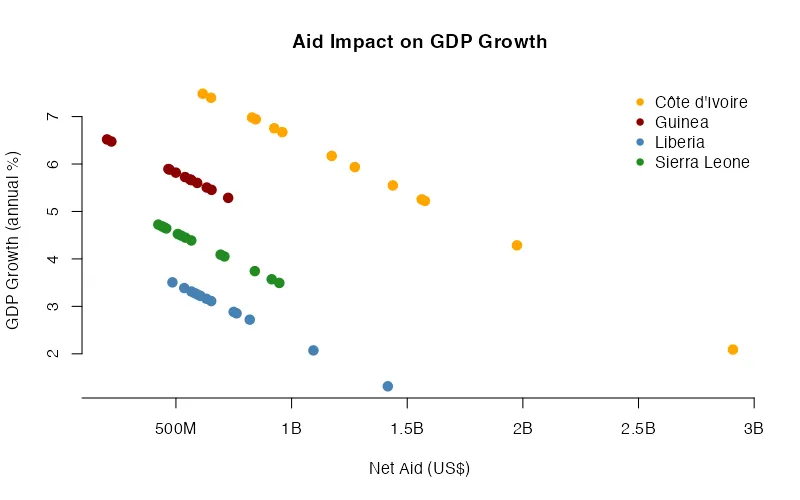 The fitted-value plot of predicted GDP growth against net aid visually confirms these relationships. The distribution of points shows that changes in aid (measured in millions and billions of US dollars) do not correlate with proportional changes in GDP growth. Côte d’Ivoire’s data points cluster toward higher aid and higher predicted growth, while those for Liberia and Sierra Leone are positioned lower, reflecting weaker economic performance despite similar aid inflows. Guinea’s points are more centered, consistent with its moderate but steady growth pattern. The overall flat slope of the fitted relationship suggests that, once unobserved country-specific effects are controlled for, aid inflows have a negligible marginal effect on growth.