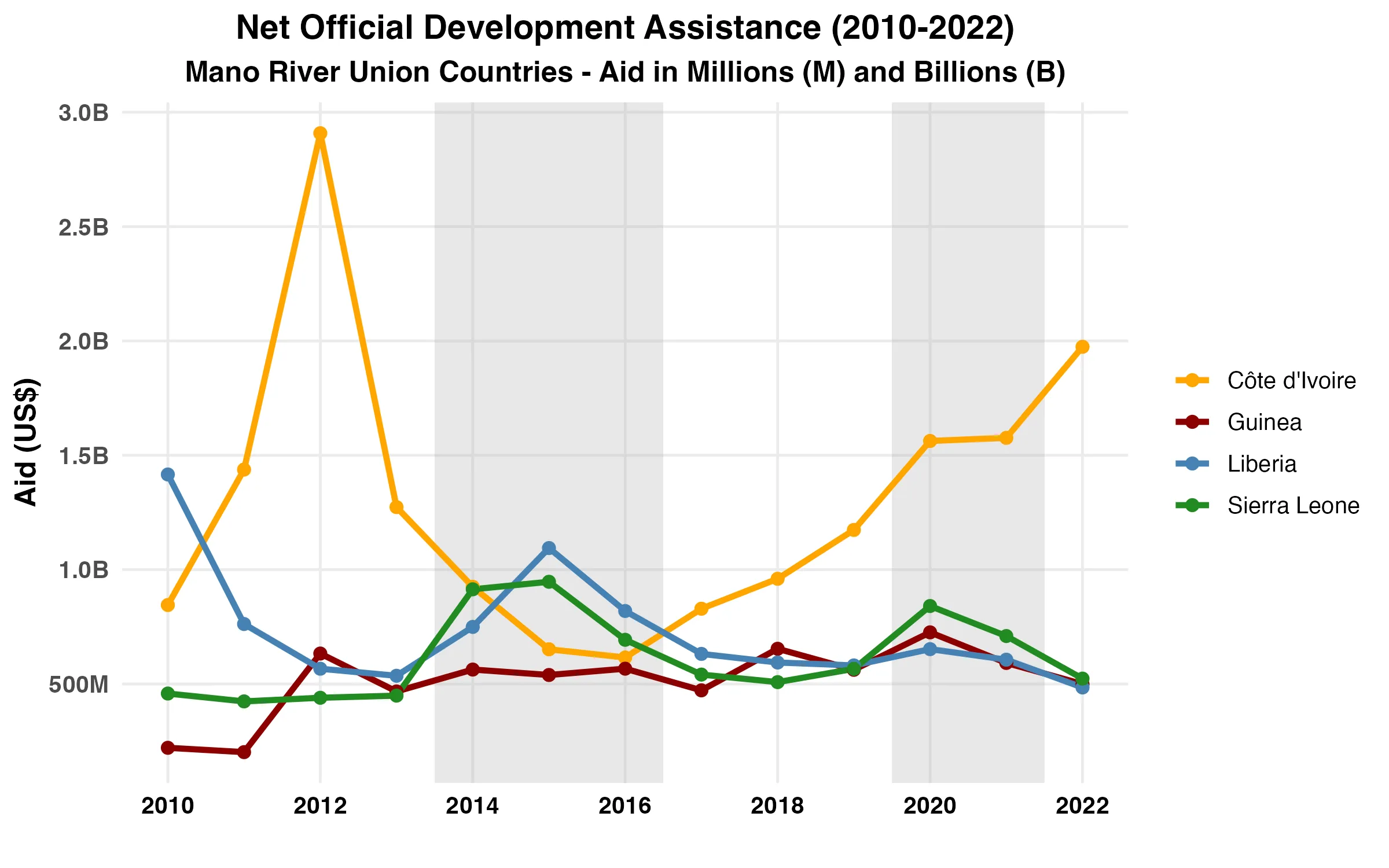 Between 2010 and 2022, MRU countries received substantial net ODA disbursements that addressed both humanitarian and development needs. For example, donor inflows increased during the Ebola crisis, as international partners, including the World Bank, USAID, the African Development Bank (AfDB), and the European Union, financed emergency responses and recovery programs following the epidemic (World Bank, 2017). Similarly, Côte d’Ivoire received considerable aid support after its 2010–2011 post-electoral crisis, which helped rebuild infrastructure and restore macroeconomic stability (IMF, 2021).