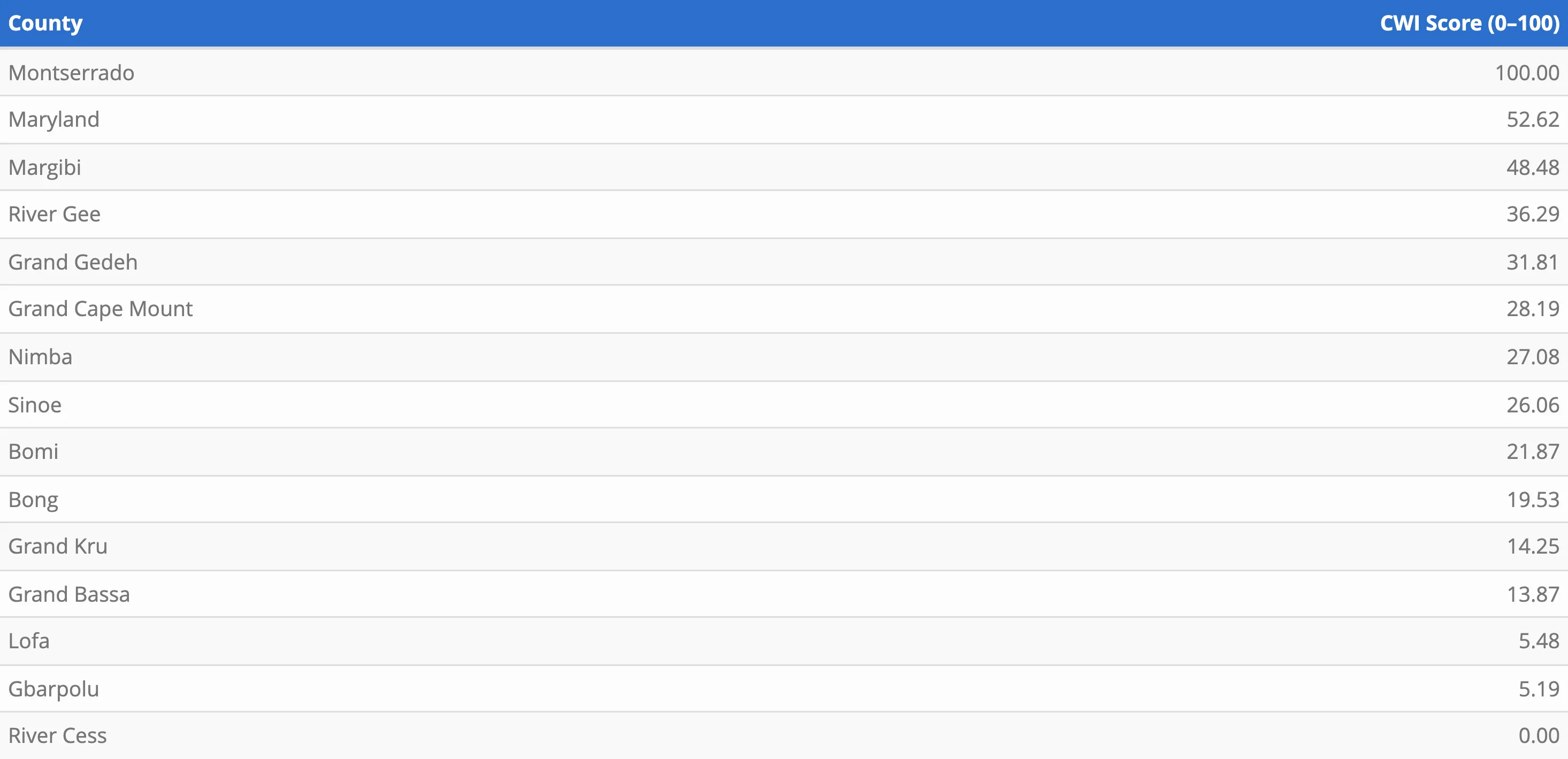The CWI at the county level reveals significant disparities in wellbeing across Liberia, highlighting pronounced geographical differences in social and economic conditions. Montserrado County leads the distribution with a perfect score of 100.00, far surpassing all other counties. This outstanding performance reflects Montserrado’s unique advantages, including concentrated economic activity, a higher population density, improved access to public services, better infrastructure, and a stronger institutional presence. Following Montserrado, Maryland (52.62) and Margibi (48.48), Maryland is the next strongest performer. While their scores are significantly lower than Montserrado’s, they still indicate comparatively favorable living standards, moderate access to services, and a more stable social environment than many other counties.