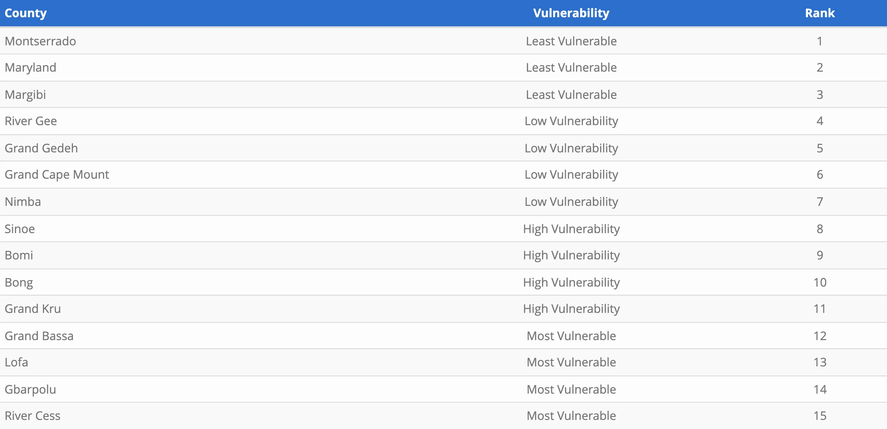 When translating these CWI scores into vulnerability categories, the stratification becomes even clearer. Counties are grouped into four vulnerability levels: Least Vulnerable, Low Vulnerability, High Vulnerability, and Most Vulnerable. The Least Vulnerable group includes Montserrado, Maryland, and Margibi, which benefit from better well-being conditions relative to the rest of the country. Their stronger social and economic indicators reveal a degree of resilience.